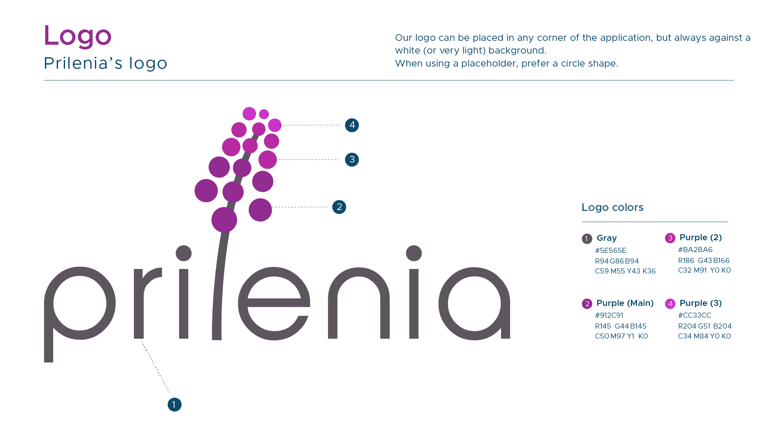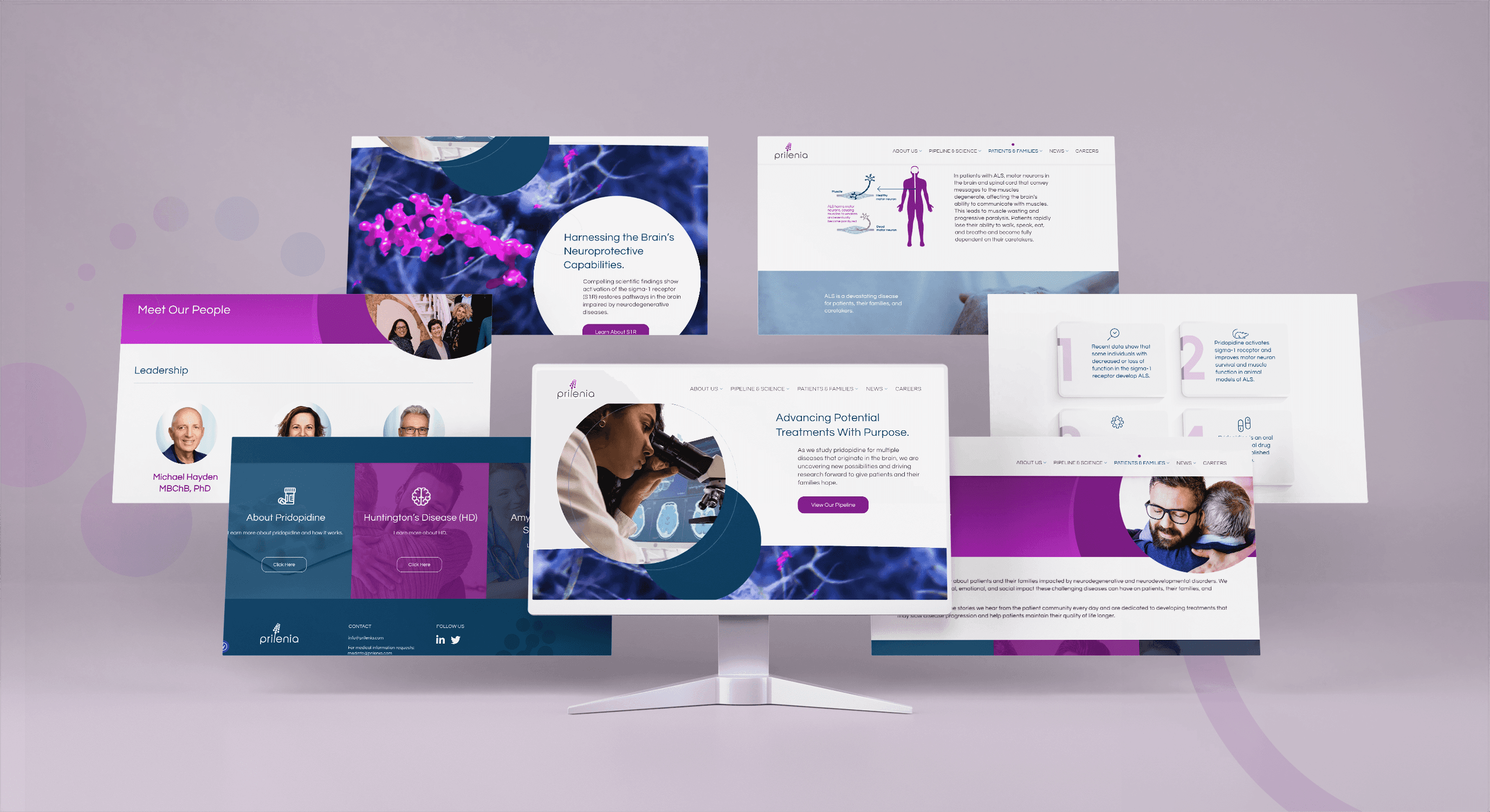 A comprehensive brand identity for Prilenia Therapeutics that bridges clinical research with human well-being through a balance of scientific authority and compassionate storytelling. The visual strategy centers on a stylized lavender logo constructed from molecular circles, symbolizing unity and the meticulous process of medical discovery. This is supported by a sophisticated palette of purples and blues for clinical excellence, modern Metropolis typography for a clean aesthetic, and human-centric photography guidelines that focus on authentic, warm moments in patients' lives.